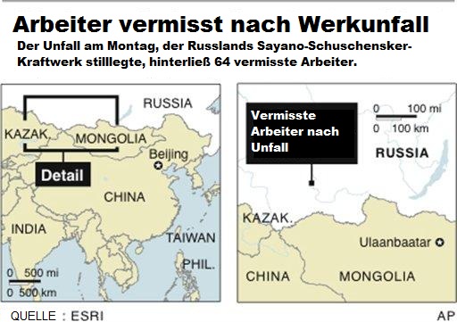 http://en.wikipedia.org/wiki/Sayano%E2%80%93Shushenskaya_hydroelectric_power_station- Bau des Kraftwerkes startete in 1968; die Anlage wurde in 1978 eröffnet. Sie wurde in 1987 teilweise umgebaut. Um 8:15 Ortszeit (00:15 GMT) am 17. August 2009 erlitt das Werk einen katastrophalen "Druckanstieg". Während Reparaturarbeiten verursachte eine plötzliche Veränderung im Wasserdruck, dass ein Wasserrohr platzte, woraus eine Transformatorenexplosion und Überschwemmung im Maschinen- und Turbinenraum folgte. Die Ursache des Unfalles ist unklar. Man spekuliert, dass defekte Turbinen und ein Druckanstieg in den Röhren mögliche Ursachen sind. Laut Alexander Toloshinov, einem früheren Generaldirektor der Anlage, lag der Unfall höchstwahrscheinlich an einem "Herstellungsfehler" in einer Turbine.