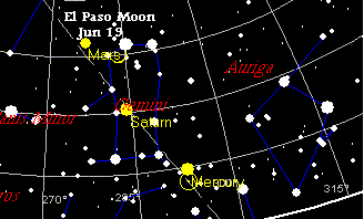On Saturday, June 19, when I came home from shopping in the evening, I saw the moon (just a sliver) here in El Paso in the early evening sky. It was Alt 30° and 310° Azi. That is pretty far North.