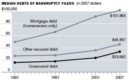 The economy's deep troubles are pushing a growing number of already struggling consumers into bankruptcy, often with far more debt than those who filed in previous downturns. Plummeting home values, dwindling incomes and the near disappearance of credit have proved a potent mixture. While all the usual reasons that distressed borrowers seek bankruptcy - job loss, medical bills, divorce - play significant roles, new economic forces are changing the calculus of who can ride out the tough times and who cannot.