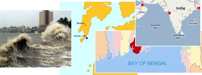 Mumbai, sinking at Bangledesh, and a slosh of water disbursing as far away as the coast of Oman. Mumbai, on the west