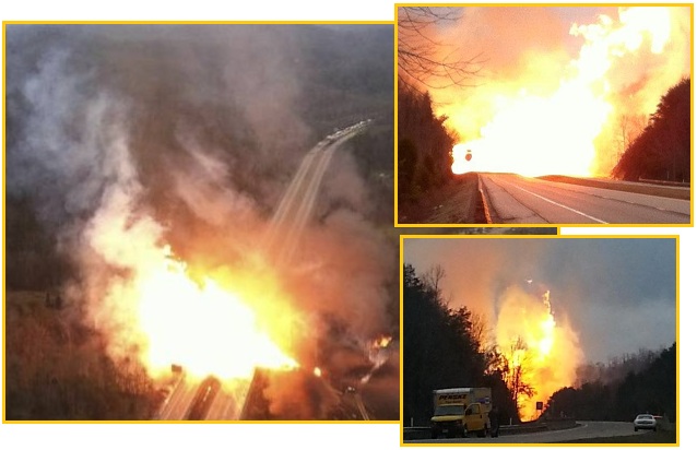 A natural gas line exploded in an hour-long inferno.  The blast area running from east to west was a quarter-mile wide, engulfing 325 feet of both the north and southbound lanes of Interstate 77. The flames were so hot under I-77 that it melted the concrete.  A 20-inch gas transmission line ruptured.