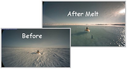 It is no surprise that the heat of the Sun has melted a small lake atop the ice at the N Pole. This hit the news as proof of Global Warming recently, though the real cause is the daily Earth wobble which leans the globe this way and that daily so more sunlight can reach the pole at times. The temperature difference in the air was slight, from prior years, and well below the freezing temperature. How would the air alone have created the melted pool atop the ice?