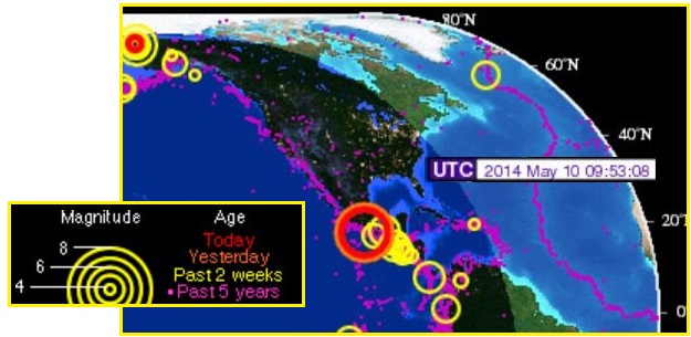 But with the increase in quakes recently, in populated areas like the continental US, keeping tight control of what is reported between the various sites falters. Note what is apparent on May 10, 2014.  IRIS, the USGS site, is showing no earthquakes on the North American continent, except for the tip of Mexico and up in the Aleutian Islands. None. Note that IRIS will show quakes of magnitude 4 or larger, yet hours after several Canadian quakes occurred, IRIS was still showing Canada without quakes. Nor did the magnitude 4 in Oklahoma dated May 7 appear.