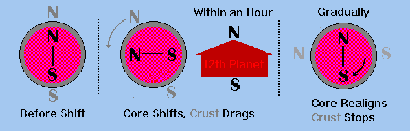 I am new to the forum, although I have been following this matter on books (thank you Mr. Sitchin) and on websites since several years. Being short minded and a little dumb, expecially at reading pictures, no matter how strong I try I cannot understand the moving of the magnetic poles. On these pages there is a nice scheme where it is shown that the N magnetic pole moves, roughly 90°drawn from the proximity of planet X. The crust follows, slowly after, of the same degrees. Then when the magnetic N pole returns to the original position (in respect to the sun?) the crust seems to remain there. I humbly ask, why? Why it shouldn't follow the magnetic pole in his wandering? And what about the rotation axis of this planet? Would it change position in respect to the Sun?