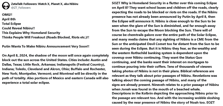 ZetaTalk Подтверждение 18.03.2024: Почему Национальная безопасность так трепещет из-за предстоящего Затмения 8 апреля? Они хотят убрать школьные автобусы и детей с дорог, явно ожидая, что дороги будут перекрыты или на них начнутся беспорядки. Если Путин еще не объявил о присутствии Нибиру к 8 апреля, то Затмение объявит об этом. Нибиру находится достаточно близко к Солнцу, чтобы ее можно было увидеть, когда солнечный блик уменьшится, и достаточно далеко от Солнца, чтобы Луна не загораживала Солнце.