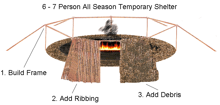A Survival shelter that I can recommend is kind of difficult to explain. I'd have to draw it for you. But it's a round shelter, it's walls are stacked walls, with four poles going up in the center which surrounds the fire pit, Bracing the poles are beams tied around the top of the poles. Now. Put long poles all around on top of the stacked walls for the roof leaving enough room for a smoke hole. Then put slabs of bark or whatever on top of the logs, and gather up a huge amount of leaves and brush and pile it on. It should be twelve feet wide from the inside of the stacked wall to the other inside side. My friends and I made one and has kept us warm whenever we camp out in it in the winter, and cool in summer.