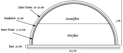 When building a Dome one needs to be careful not to make the walls to thick. We dont want the Dome to break under its own weight. Concrete is strong and heavy. The Outer Dome has to be reinforced to withstand the pole shift. The Inner Dome has to be even more reinforced and also have a couple of pipe systems (1 cm inner pipe diameter) for cooling and warming. Ventilation can be solved.