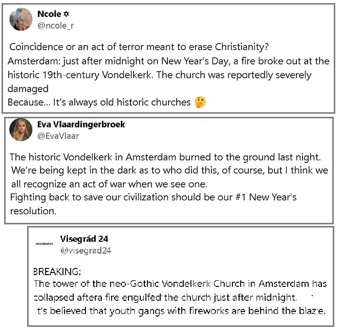 Двое погибших и церковь, уничтоженная пожаром, в результате «беспрецедентного» новогоднего насилия в Нидерландах 1 января 2026 г. https://www.euronews.com/2026/01/01/two-dead-and-church-gutted-by-fire-in-unprecedented-new-years-violence-in-the-netherlands Тем временем в Бельгии были зафиксированы аналогичные случаи, когда полиция подвергалась обстрелу из фейерверков. По меньшей мере два человека погибли в Нидерландах в результате серии жестоких инцидентов в канун Нового года, которые голландская полиция называет «беспрецедентными». [и из другого] Два человека погибли в результате взрыва фейерверка во время «беспрецедентного» новогоднего насилия в Нидерландах, а историческая церковь в Амстердаме сгорела дотла. 1 января 2026 г. https://www.the-sun.com/news/15718873/two-killed-fireworks-new-years-eve-netherlands-church-flames/ Во время празднования Нового года в Нидерландах вспыхнул хаос: два человека погибли в результате взрыва фейерверка, полиция столкнулась с «беспрецедентным» насилием, а в исторической церкви в Амстердаме произошёл разрушительный пожар. [и из другого] В результате взрывов фейерверков в Нидерландах погибли два человека; пожар уничтожил историческую церковь в Амстердаме 1 января 2026 г. https://www.reuters.com/world/fireworks-accidents-kill-two-netherlands-fire-destroys-historic-amsterdam-church-2026-01-01/ В Нидерландах Новый год традиционно встречают запуском фейерверков, что ежегодно приводит к сотням травм и ущербу на миллионы евро. По словам полиции, в этом году в канун Нового года было арестовано около 250 человек, а в нескольких городах были задействованы силы по борьбе с массовыми беспорядками. [и из другого] Париж и Лондон отменяют фейерверки из-за страха перед исламом 1 января 2026 https://www.frontpagemag.com/paris-and-london-cancel-fireworks-viewings-due-to-fear-of-islam/ И никто не будет говорить почему. Настоящий фейерверк не взлетает в небо, он взрывает страны и ставит их перед выбором между бесконечным террором и войной. [и из другого] https://t.me/ZetaTalk_Followers/81411 [и из другого] Собор Парижской Богоматери горит 28 апреля 2019 года https://www.zetatalk.com/russia/issue656.htm 15 апреля весь мир с ужасом наблюдал за тем, как горел знаменитый и любимый всеми Собор Парижской Богоматери. Эта икона, история которой насчитывает 850 лет, каким-то образом загорелась в самом сердце Парижа, и поползли слухи о заговоре. Возможно, это произошло из-за продолжающихся ремонтных работ, из-за какого-то инструмента или вещества, оставленного рабочими. Возможно, это была атака ИГИЛ, поскольку в 2016 году на этот собор уже совершалось покушение. В последнее время церкви во Франции подвергаются нападениям, как и мечети в Иерусалиме.