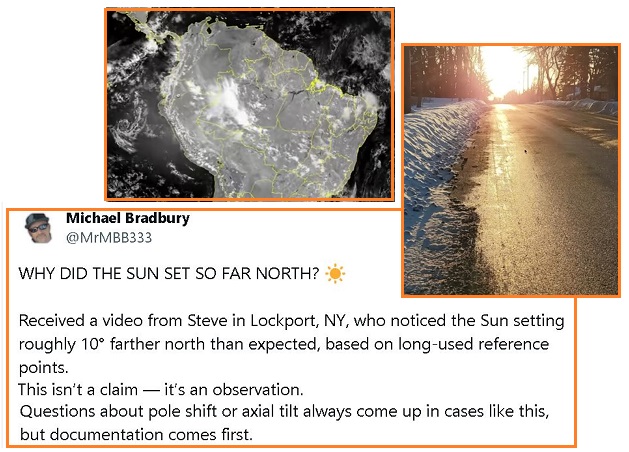The Sun Isn't Appearing Where It SHOULD Be https://www.youtube.com/watch?v=O8ZJAF4Ppfo Mr MBB333 Notes at 7:40 that the Sun is registering on February 5 where it should be on the Equinox on March 31, too early. At 10:40 in the vid sunset in NY on February 1 is over a month early, Sun too far North. [and from another] https://x.com/MrMBB333/status/2019523612437581868 Mr MBB333 suggests Earth is in a wobble. [and from another] http://www.zetatalk.com/newsletr/issu1007.htm "perhaps a severe wobble with the Sun rising at the N Pole ... a Severe Wobble where the Sun rises at the N Pole would be hard to cover up and hard to explain." [and from another] https://poleshift.ning.com/profiles/blogs/earth-wobble-mechanics Ms Sakamaki January readings show sunrise coming approximately 15 minutes late and rising too far to the south, as though an early Spring were occurring.